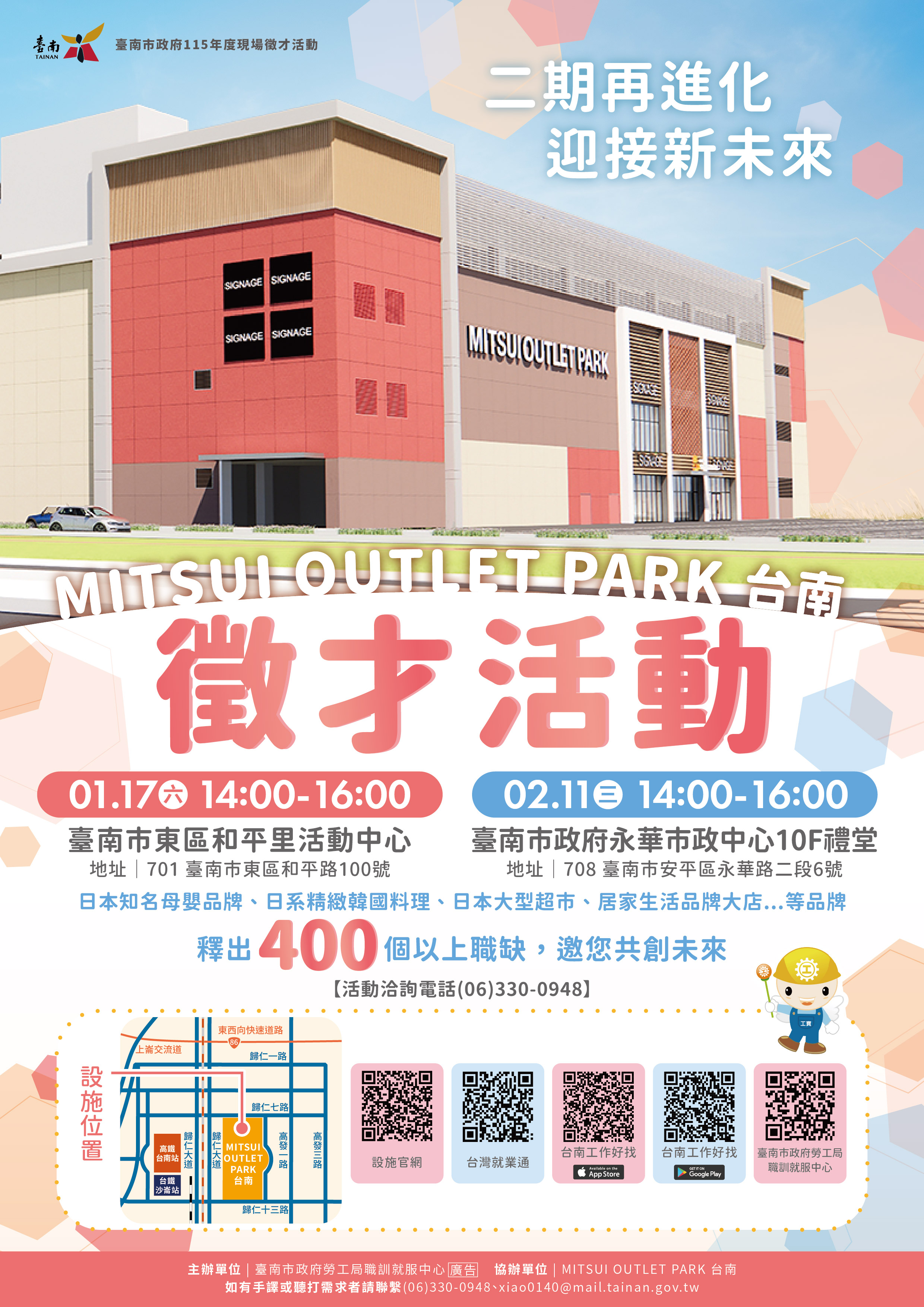 一、為協助本市重大投資之一的日系集團三井OUTLET二期能順 利徵才,本中心將於1月17日(週六)於東區和平里活動中 心(臺南市東區文化路100號)、2月11日(週三)於永華 市政中心10樓禮堂(臺南市安平區永華路二段6號)辦理聯 合徵才活動,請貴單位依下列自有管道協助宣傳(若無該 管道則免),以利求職民眾知悉,加強活動曝光並達宣導 之效。