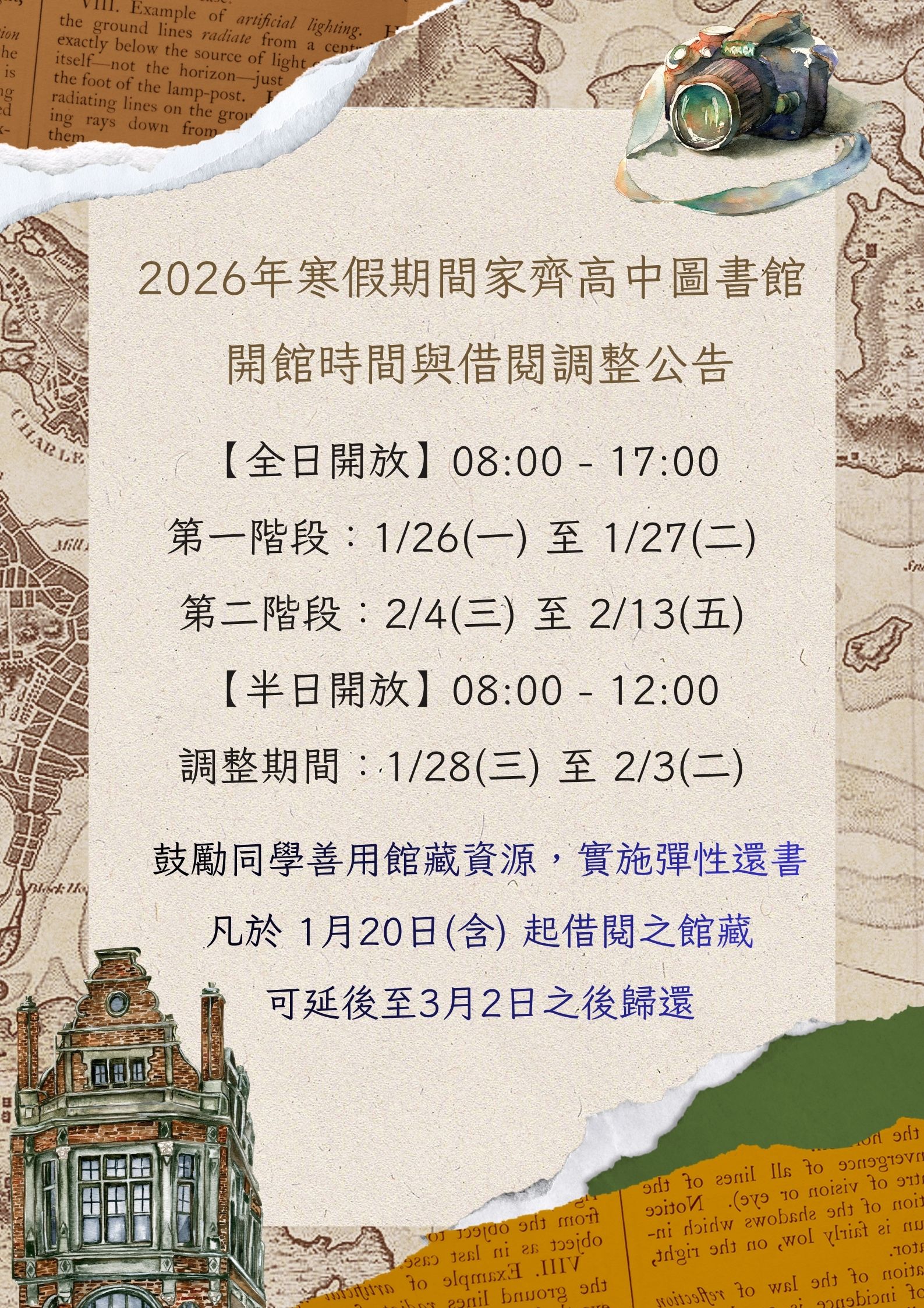 另為方便同學們利用寒假期間利用館藏資源,1/20起所借閱館藏,可於3月2日後再行歸還。