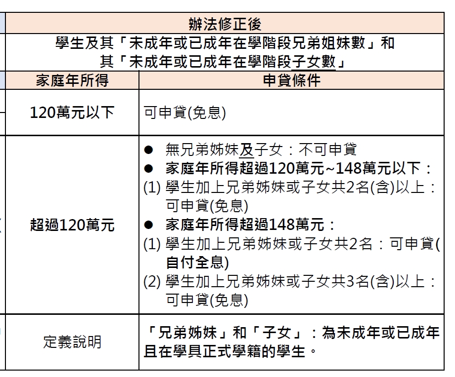 - 學生及其兄弟姐妹,或學生及其子女數有2名者(含未成年或已成年在學階段),則家庭年所得總額放寬至148萬元以下均可申請貸款,且在學期間免利息。