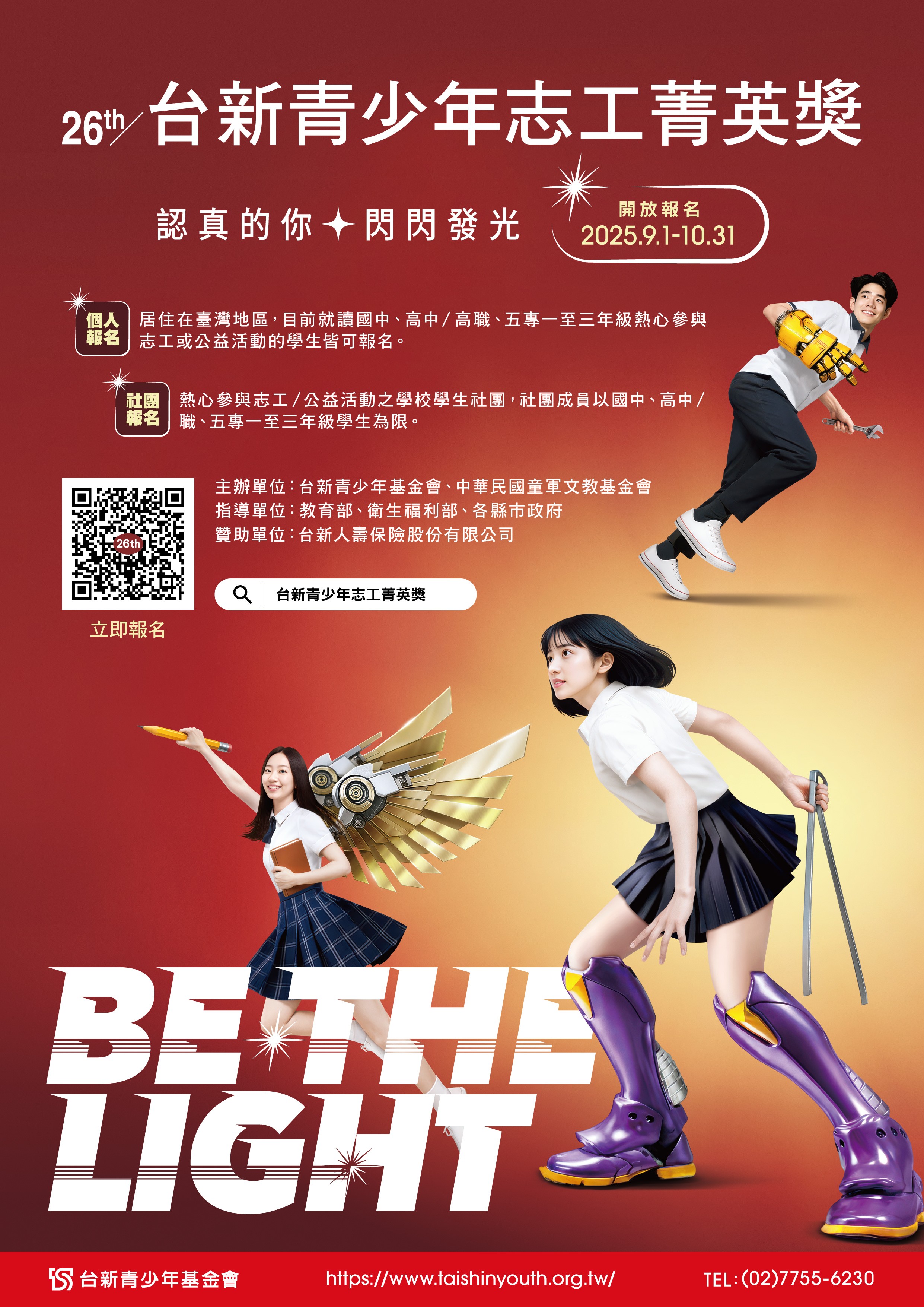 二、旨揭活動受理報名至114年10月31日止,獎項分為「個人服務」、「社團服務」2項類別,相關報名資訊請逕至該活動網站查詢:https://www.taishinyouth.org.tw/2025apply,如有問題請洽活動專線(02-7755-6231)。
