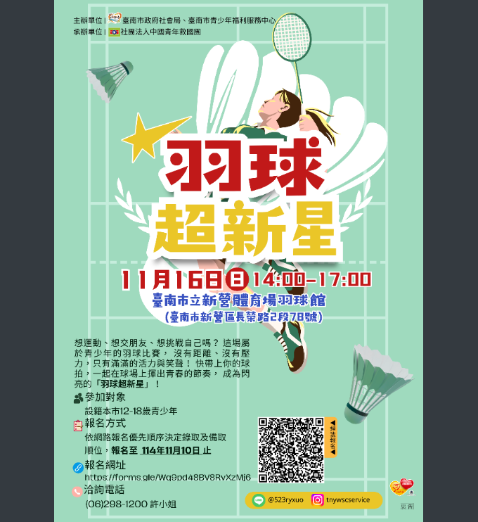 臺南市社會局青少年福利服務中心「羽球超新星」育樂活動