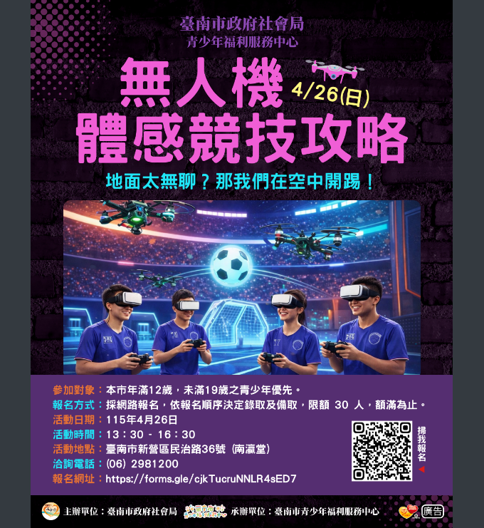 臺南市政府社會局青少年福利服務中心「骨牌玩家」及「無人機操控體驗」育樂活動